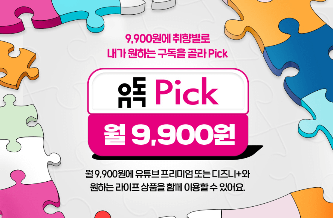 LG U+ '유독'서비스는 월 9,900원에 유튜브 프리미엄 또는 디즈니+를 취향껏 골라서 이용할 수 있어요. 또한 내가 원하는 라이프 상품은 덤! 스노 VIP, 배스킨라빈스 파인트, 리디셀렉트, 파리바게뜨 2,500원 할인쿠폰 등 선택할 수 있습니다.
