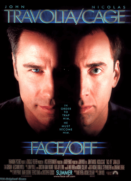 < 페이스 오프> - 장르 : 액션 - 개봉 : 1997.08.09 불굴의 FBI 요원 션 아처(존 트라볼타 분)는 어린 아들 마이키를 죽인 잔혹한 범죄자이자 LA 어딘가에 생화학 폭탄을 품고 있는 악랄한 청부업자 카스토르 트로이(니콜라스 케이지 분)를 반드시 붙잡아야 한다. 그들은 LA를 날려버릴 수 있는 비극을 막아야 한다. 션은 여러 차례의 충돌 끝에 나라를 탈출하려는 트로이를 붙잡지만 체포되자 카스토르는 혼수상태에 빠져 의식을 잃는데... |